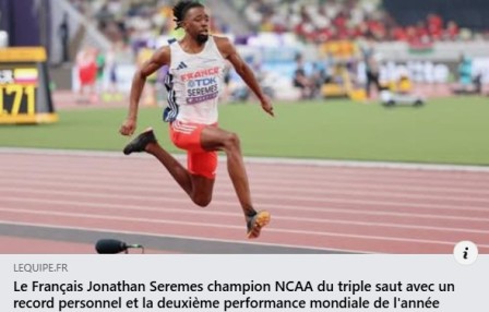 Vendredi, en remportant le triple saut à 17,25 m des championnats universitaires américains en salle à Fayetteville, le Stadiste Bordelais Jonathan Seremes a du même coup battu le record régional qui était détenu par l'alors Stadiste Bordelais Melvin Raffin : 17,19 m le 1er juin 2021 à Montreuil. Plutôt de bon augure avant son rendez-vous vendredi prochain à Torun pour les mondiaux en salle.